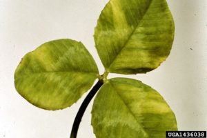 ลักษณะอาการโรคโดยทั่วไป: ใบมีขนาดเล็กลง ด่าง หดย่น ขอบใบม้วนลง ต้นแคระแกร็น ปล้องที่ยังอ่อนจะไม่ขยายออก